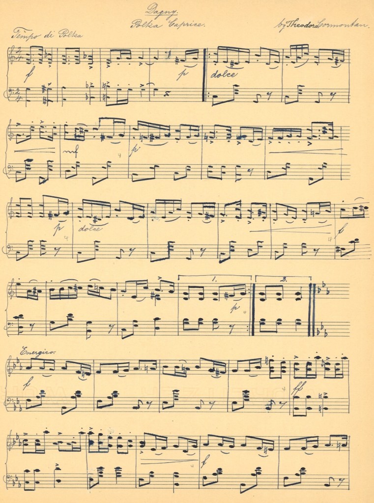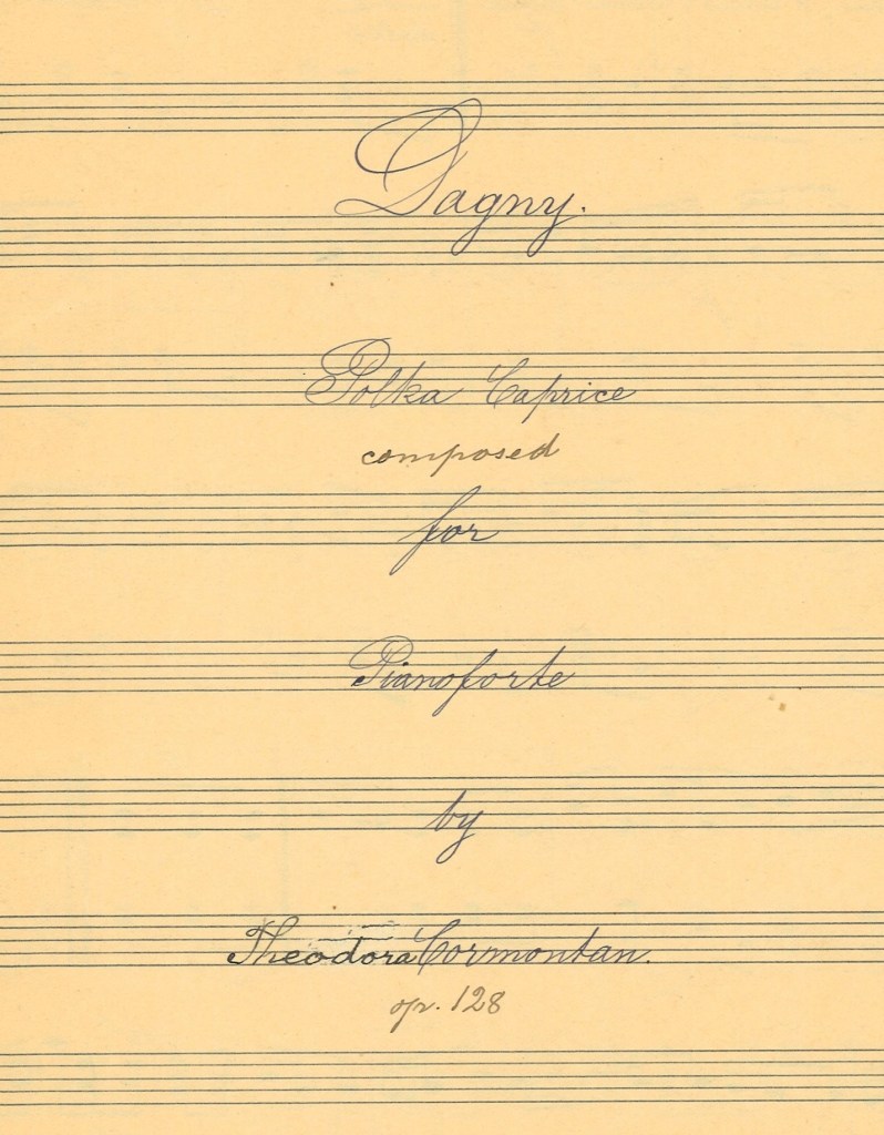 The Cormontan music that Bonnie and Michael rediscovered includes six piano solos published in the United States and approximately 125 manuscript scores (the exact number depends on how several incomplete works are counted). The vast majority of the manuscripts are piano solo, but there are a few hymns, works for the organ, vocal solos, and vocal duets as well. Almost all the manuscripts are in ink and stand as completed works. Theodora may have sent these copies to potential publishers and/or used them as performance copies. There are a few works in pencil that seem to be draft copies.