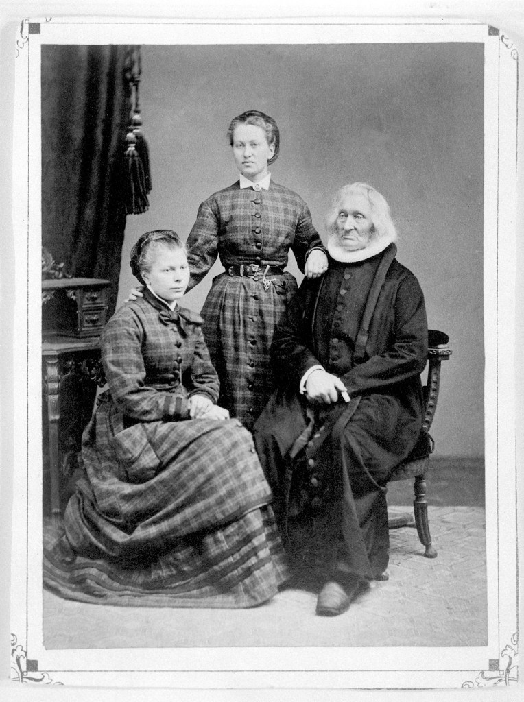 (above) Theodora (standing) with her sister Eivinda and her father Even. This picture probably dates from shortly after Theodora returned home in 1865. In this picture Theodora has literally been placed in a central position, with one hand on her sister and the other on her father. Also, look at the three expressions. I could be wrong, but I read resignation in Eivinda, sorrow in Even, and an almost fierce determination in Theodora. This picture is one reason I believe Theodora assumed a leadership role when she returned home in 1865.