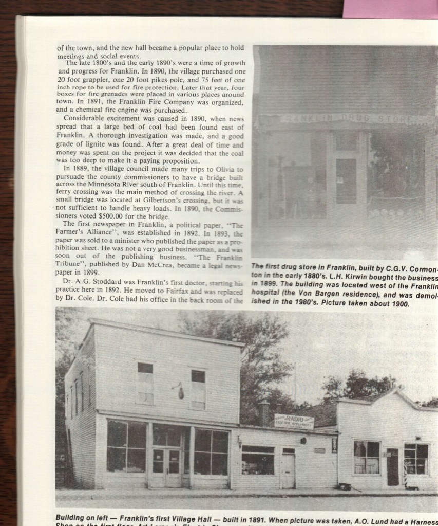 Pastor Cormontan, Theodora, and Eivinda all moved to Franklin, MN in 1888, where C.G V. owned and operated the Franklin Drug Store. C.G.V. also served several years as a town councilman. Newspaper clippings from the St. Paul Daily Globe in October, 1889 report that Eivinda and Theodora Cormontan were in St. Paul attending court. Theodora brought suit against the Chicago, Milwaukee and St. Paul Railway Company for damages from injuries received in Granite Falls, MN in December of 1887. The train lurched forward as Theodora was boarding to return to Sacred Heart, causing her to fall and resulting in a spinal injury that left her physically disabled. The jury found in favor of the plaintiff and awarded her $5,000 damages.