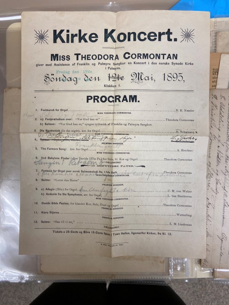 After our first presentation in September, 2011 at the Ft. Ridgely and Dale Lutheran Church, we presented many performances of Theodora Cormontan’s music, mostly in Minnesota but also in Iowa, Wisconsin, Florida, Washington, and Winnipeg, Canada. On May 28, 2015 we donated Theodora Cormontan’s scores to the National Library of Norway (Nasjonalbibiloteket) in Oslo and performed her music there with a group of musician friends, including Barb and Roger. On June 2, 2015 we gave a concert at the cultural history museum (KUBEN) in Cormontan’s hometown of Arendal, Norway.