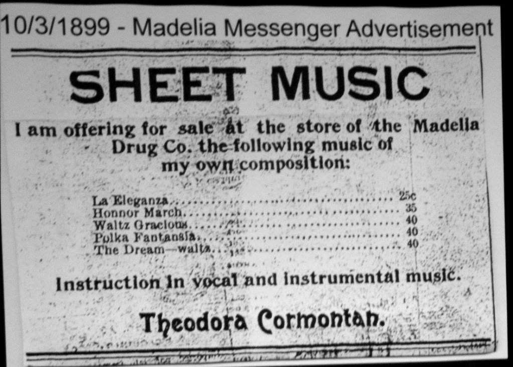 In February of 1899 C.G.V. Cormontan purchased the Madelia Drug Company on Main Street in the town of Madelia in Watonwan County, Minnesota. By March Theodora described herself as a composer and music teacher in ads in the Madelia Messenger. In October of that year she advertised that she was selling several of her own compositions at the drug store. In her advertisements for her teaching, Theodora described herself as “Pupil of Europe’s Greatest Musicans” and said she “gave instruction on piano, organ, and vocal.” She said she practiced “The newest and best methods . . . Vocal Culture, Mathilde Marchesi’s Italian Singing Method.” It appears she offered piano and voice lessons from her home on 405 Shepard Street in Madelia. She offered organ lessons at another residence on Shepard. She traveled to Linden and Hanska, Minnesota to offer music lessons to students of those towns.