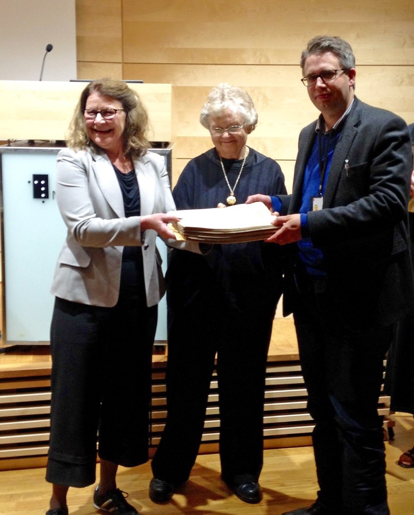 (above) Nancy Clasen (left), the great-great grand niece of Theodora Cormontan, and Barb Nelson present the music of Theodora Cormontan to Richard Gjems at the National Library of Norway (Nasjonalbiblioteket) on May 28, 2015.