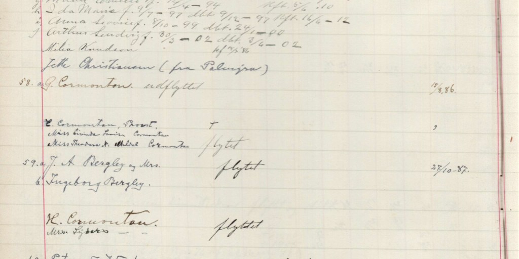 In 1887 the 89 year old father boarded the steamship Hekla with his two daughters to spend their last years together with the surviving children in Franklin, [Minnesota], USA. The Provst died in 1892 [1893], and his unmarried daughter worked for many years as a music teacher. Theodora Cormontan appears to have lived until about 1920. [Theodora Cormontan died on October 26, 1922].