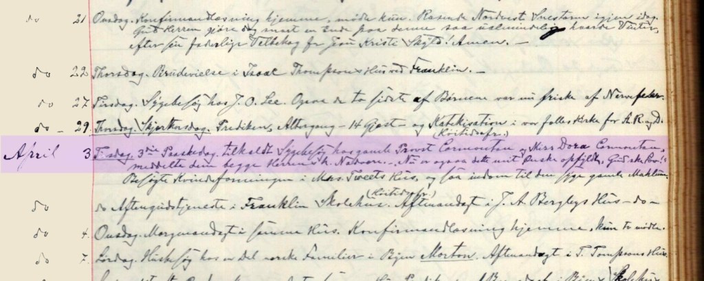 Theodora came from Norway to the United States with her father Even and older sister Eivinda, almost certainly to live with her older brother Gottfred Christian Vogelsang Cormontan (known as Gottfred, Christian, C.G., or C.G.V. Cormontan). C.G.V. received his druggist/pharmacist degree from the Norwegian University on December 10, 1868, and moved to the U. S. in 1873. He became a naturalized citizen on June 8, 1880 in Clayton Co., Iowa, where he was a school teacher. By 1881 he had moved to Sacred Heart in Renville County, Minnesota where his youngest sister Marie had lived since 1880 with her husband, Edvard Lyders, also a druggist. Around this time C.G V. returned to Norway, perhaps to visit his father and sisters Eivinda and Theodora. He returned to Sacred Heart in 1884. In the summer of 1887 Theodora, her father Even, and her sister Eivinda temporarily moved to Sacred Heart to live with Marie and family, while C.G.V. now lived in Franklin, Minnesota. C.G.V.’s older brother Hans Nicolai Patroclus Cormontan, a carpenter, also came to Sacred Heart in 1887, probably from Illinois. None of the four siblings were married. Their mother, Louise Augusta Hirsch, died in 1865.