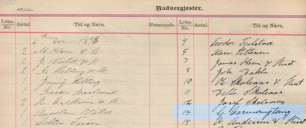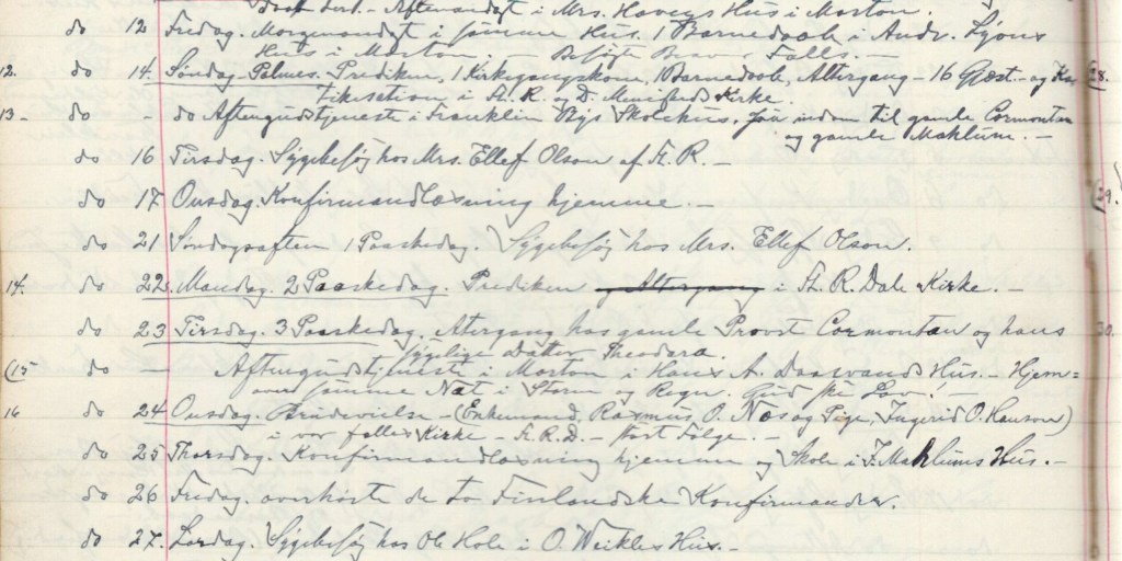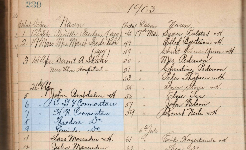 By 1904 C.G.V. Cormontan works as a pharmacist in Kennedy in far northern Minnesota. Before the end of the year, the other three family members move back to Madelia. In the 1905 Minnesota census it appears that Theodora and Hans are in one location while Eivinda is in another; probably only temporarily. There is evidence that they returned to the West Lutheran Church to worship.