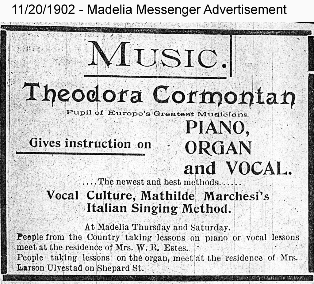 Madelia Times-Messenger 10/28/1904, in the Local News section: “Theodora Cormontan, pupil of Europe’s greatest musicians, gives instruction on Piano, Organ and Vocal. Instrumental music is taught by the newest and best of methods. Vocal Culture, Mathilda Castorne Marchesi’s singing method. At Madelia Thursdays, Fridays and Saturdays. New scholars call on Mrs. M. Dossett or Mrs. J. Nielson.”