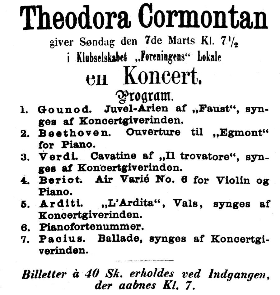 The November 17, 1866 issue of the Drammen Blad newspaper indicates that Theodora would be performing in the capital of Norway (at that time called Christiania): “Miss Cormontan from Arendal, who lived in Copenhagen for several years and enjoyed singing solos there, and who is reportedly already a very advanced singer, endowed with a beautiful and sonorous voice, is said to be engaged by the opera company at the Christiania Theater.”