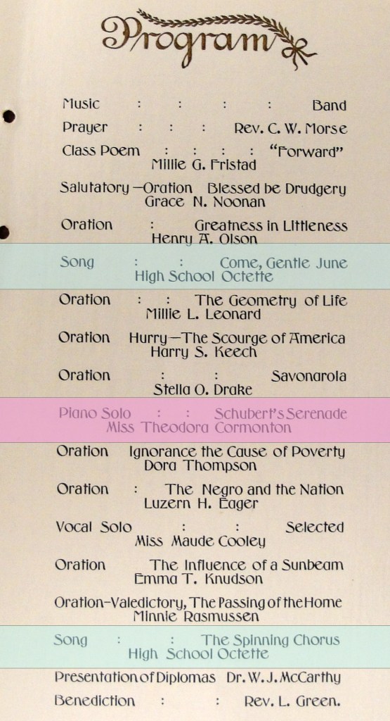 (above) A copy of the program for the 1906 graduation. Stella Drake (mentioned below) sang in the High School Octette.