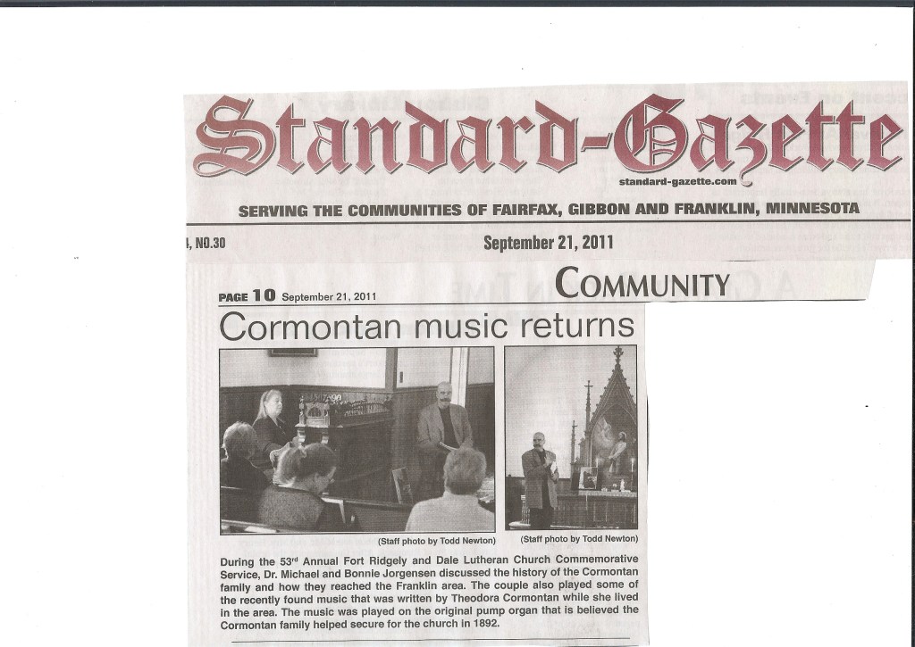 The front page of the Granite Falls Tribune reported on October 18, 1887 that “Miss Theodora Cormontan, of Sacred Heart, will give a concert at Winter’s Hall Friday evening, Oct. 21st, consisting of vocal and instrumental music. Miss Cormontan studied music for 7 years in Germany and other countries in Europe; has given concerts at Copenhagen, Denmark and Arendahl [sic] and other cities in Norway. She will sing English, Norwegian, Swedish, German and Italian, some of the pieces being of her own compositions. The concert promises to be a rich treat and let all remember the day and place.” In a review of the concert on October 25, 1887, the front page of the same paper read “The concert at the hall on Friday last was well patronized and we hear many flattering words of praise for the singer who entertained for nearly two hours. Her superior gift is plainly instrumental music and her admirers are numerous. We hope to hear her again.” Cormontan advertised as a teacher of vocal and instrumental music in the Granite Falls paper that November and December.