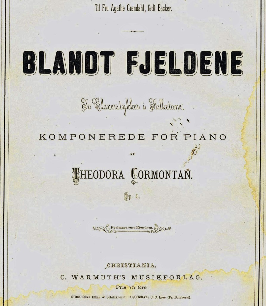 A nationalistic tone is not prominent in Theodora Cormontan’s music, although she was influenced by the nationalism in the music of Nordraak, Kjerulf and Grieg. Only in her Op. 3 does she make a nationalistic reference, in “Blandt Fjeldene”[“Among Mountains”] that is described under the title as being in the style of two folk songs for piano. [There are numerous pieces that display strong nationalism among her manuscripts]. “Blandt Fjeldene“ is dedicated to Mrs. Agathe Backer Grøndahl, and it is not impossible that the two may have met when Agathe was in Arendal to visit her cousin, postmaster Nils Backer. [A new, revised version of a movement from this work can be found in the manuscripts]. Cormontan also wrote fantasies and paraphrases based on hymns, including”Kjærlighed er Livets Kilde” [“Love is the Source of Life”], “Fred til Bod for bittert Savn” [“Peace to the Source of bitter Loss”] and “Herre Jesu Christ” [“Lord Jesus Christ”].