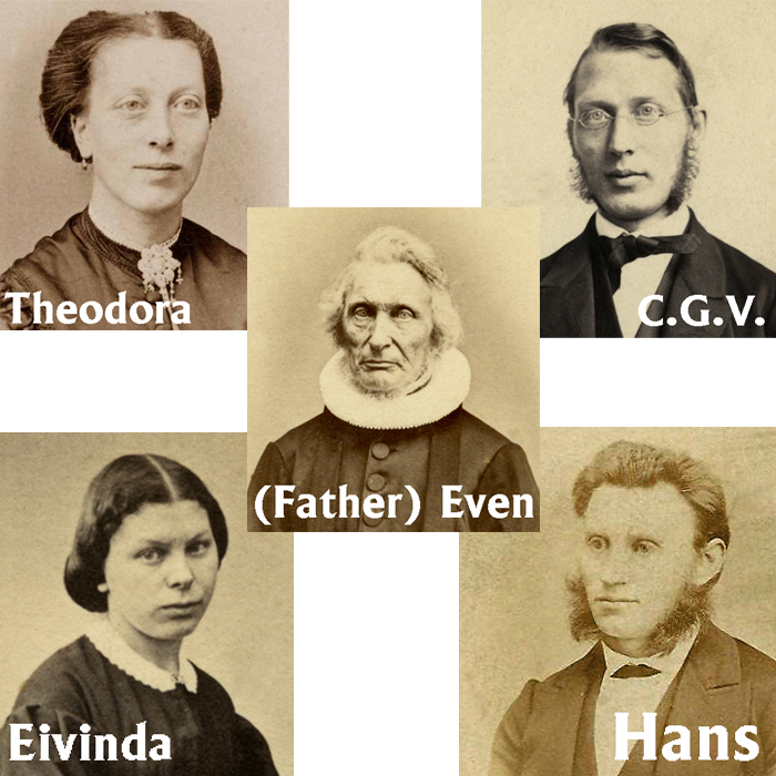Her last name does not sound Norwegian, but Theodora’s father was born in Øvrebø, Norway, himself the son of a priest. His Danish grandfather’s last name was Hansen. The grandfather came from Hjerteberg in Stege, Denmark. The Latin equivalent for Hjerteberg [Danish for “Heart of the Mountain”] is Cor Montan–Cormontan.
